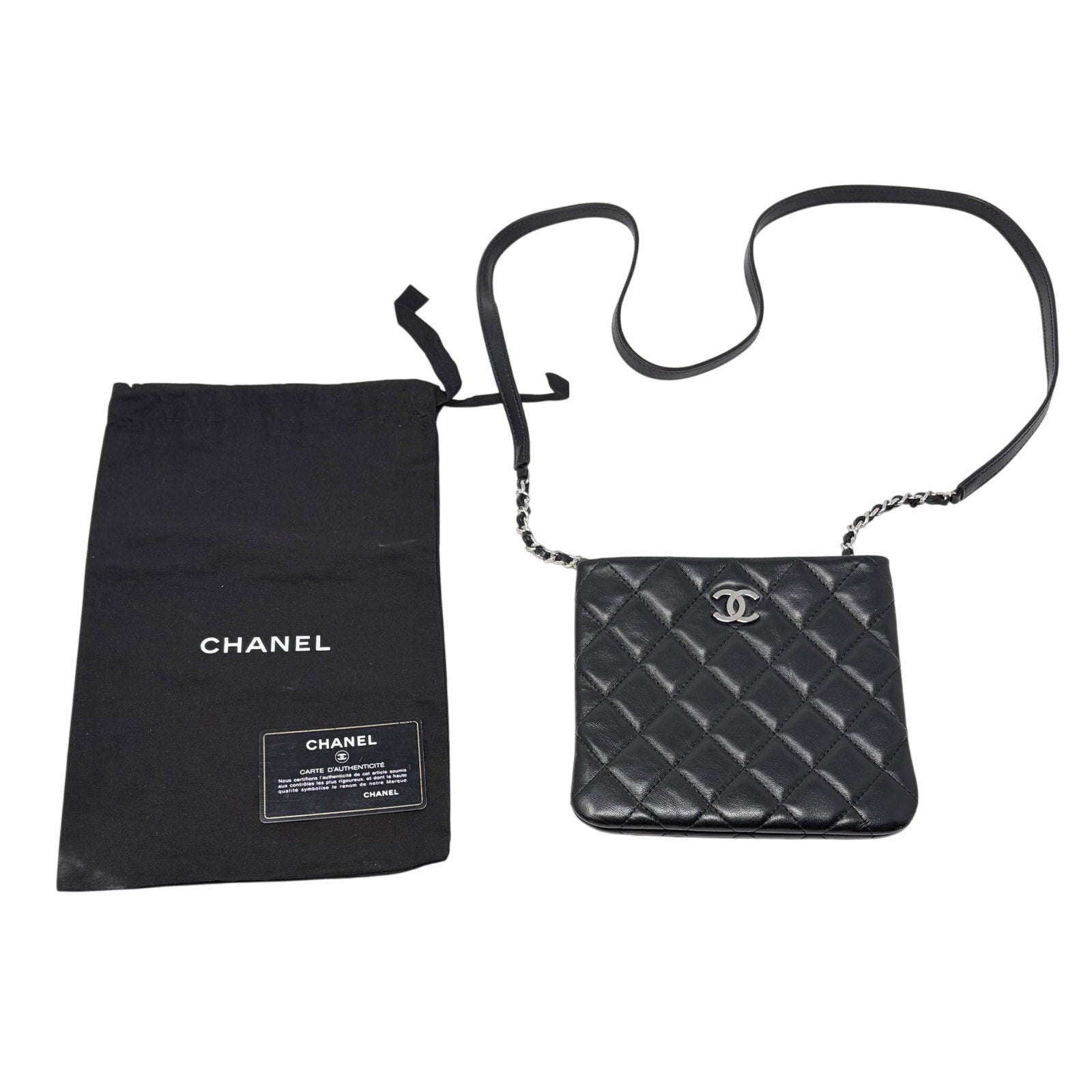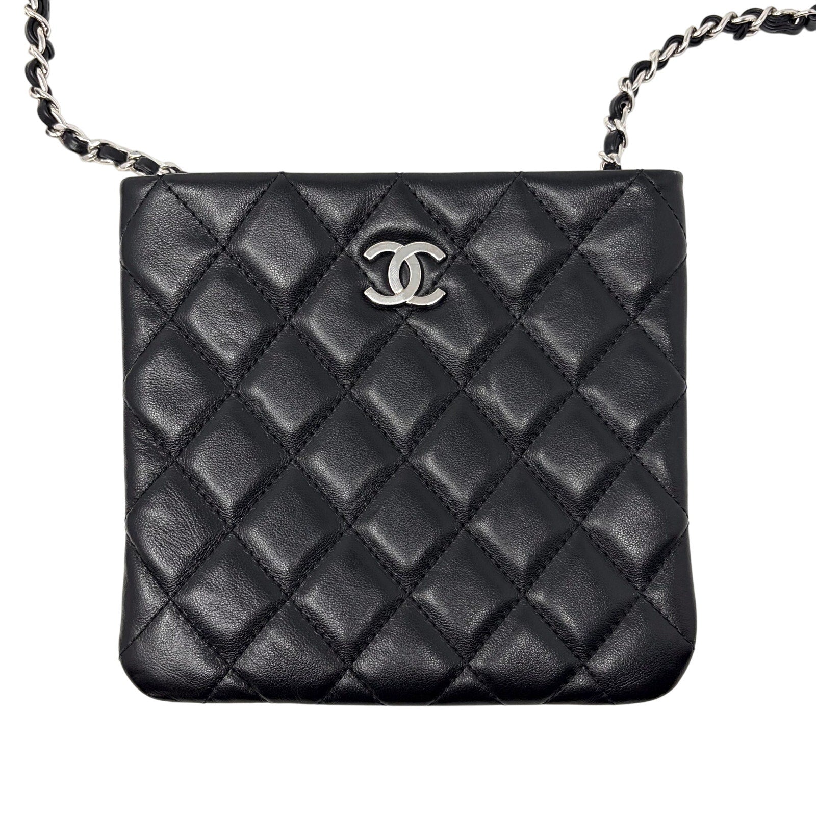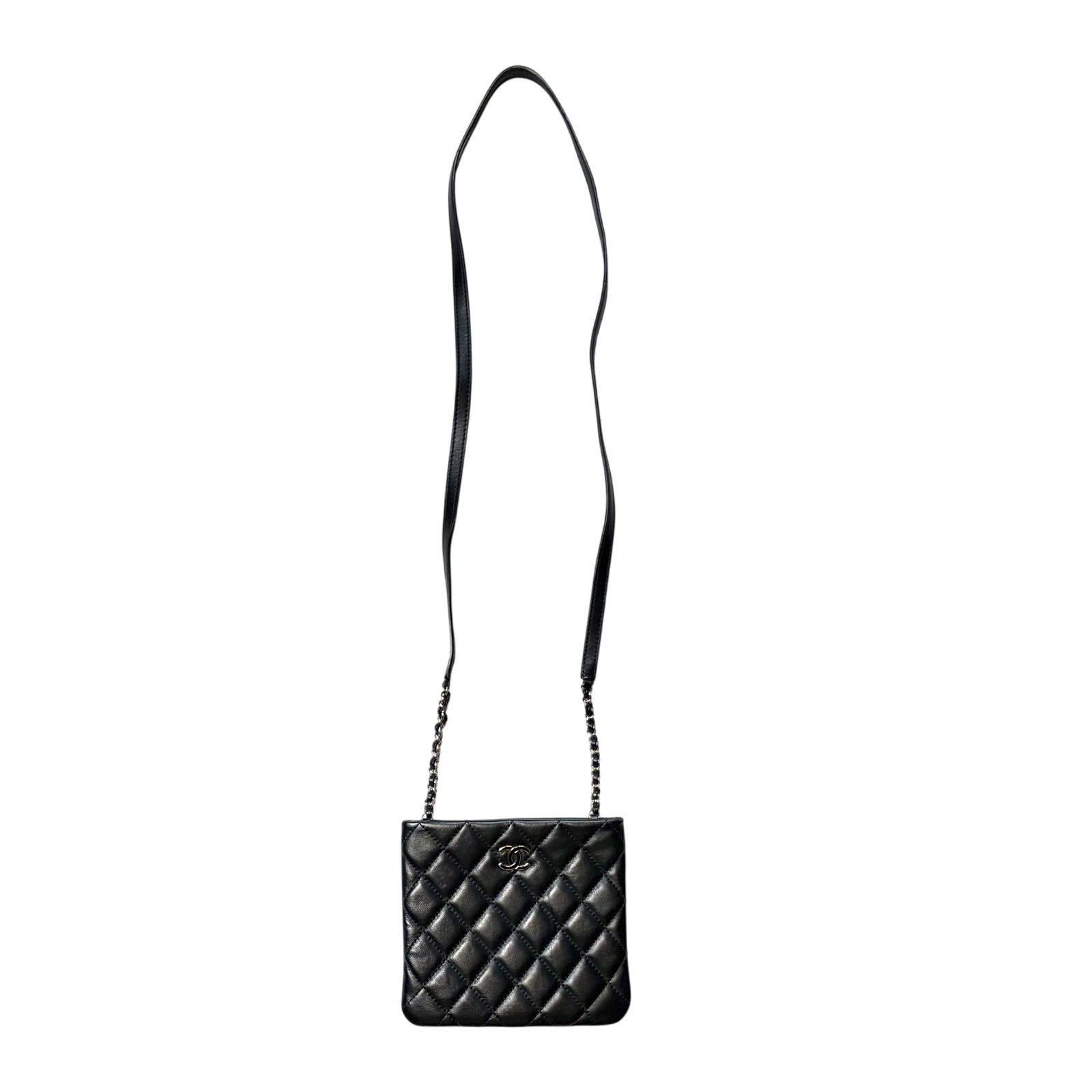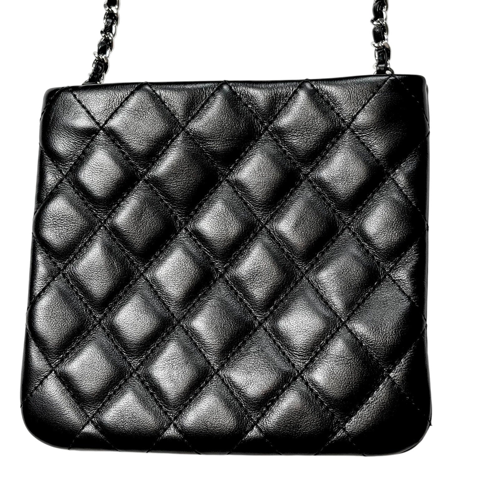 Beautiful Quilted Mini Crossbody Bag made of super soft Lambskin & finished in Black with Silver CC Logo across the front.