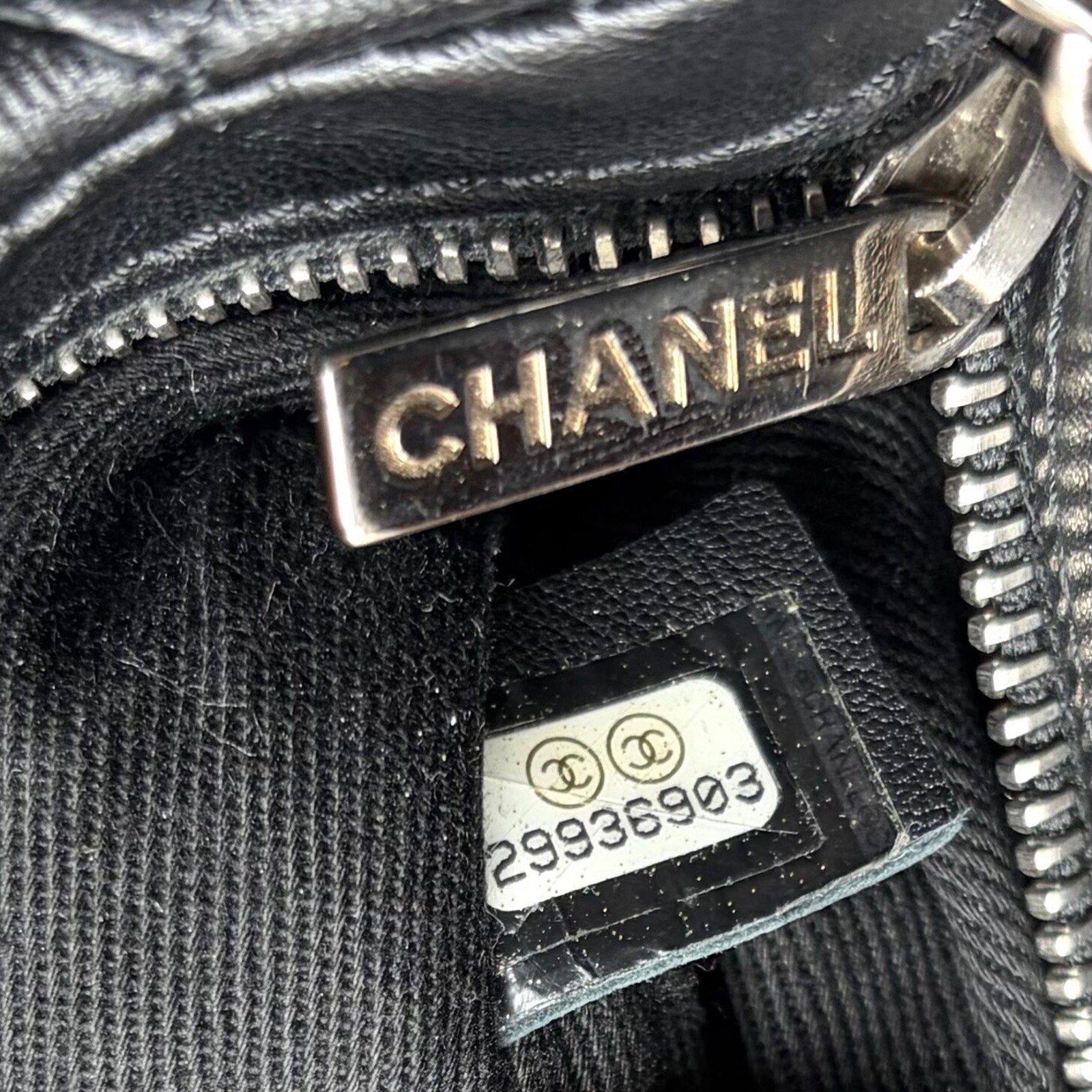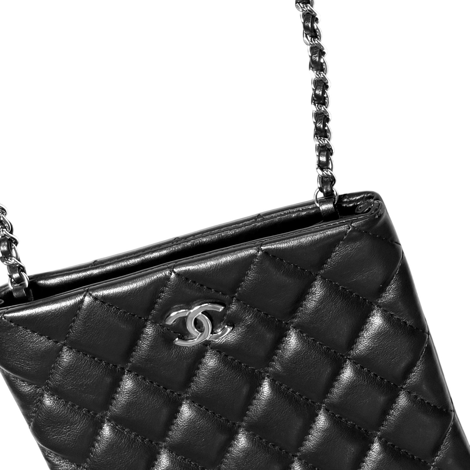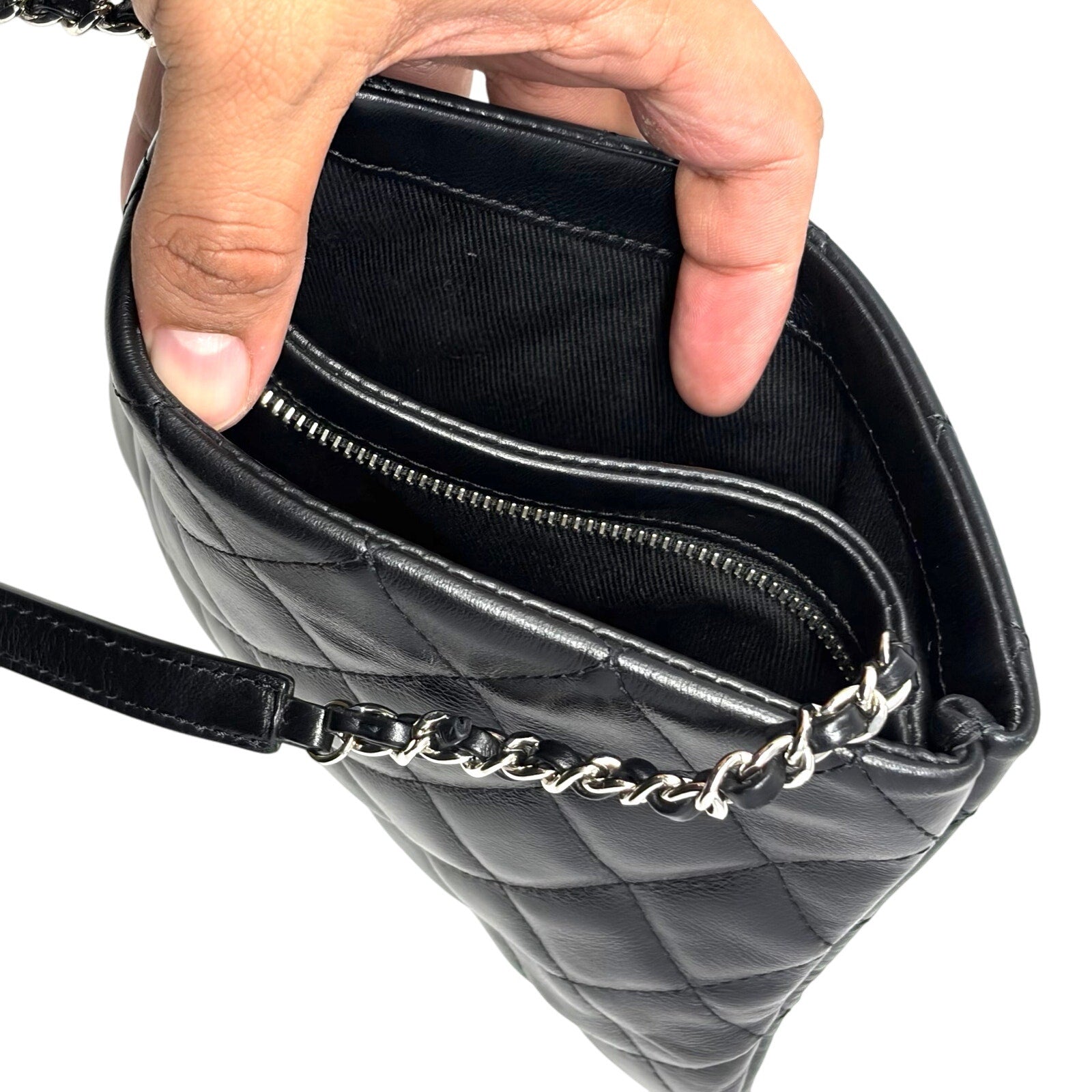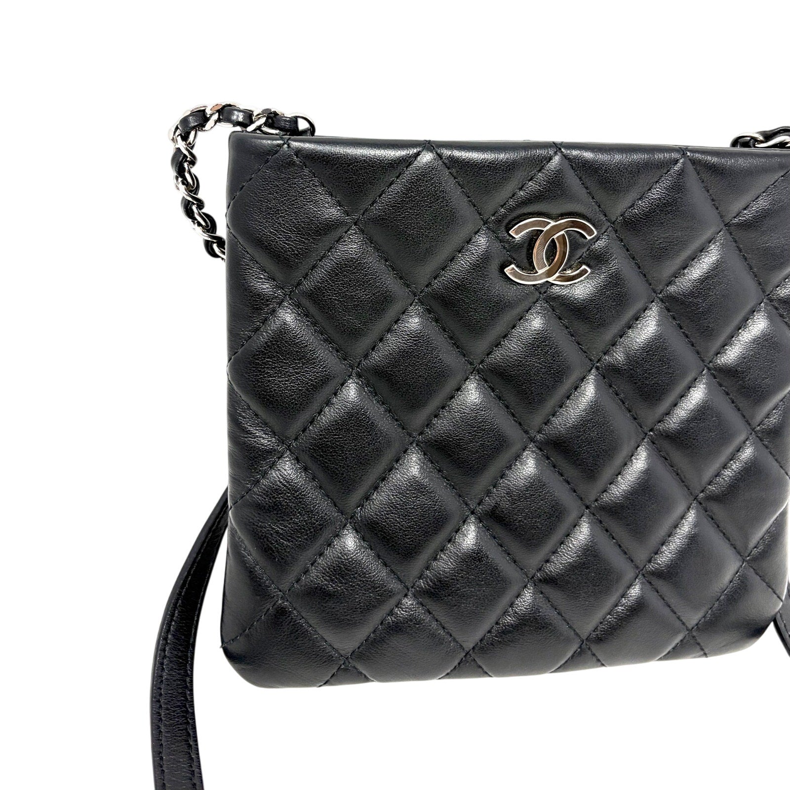 Beautiful Quilted Mini Crossbody Bag made of super soft Lambskin & finished in Black with Silver CC Logo across the front.