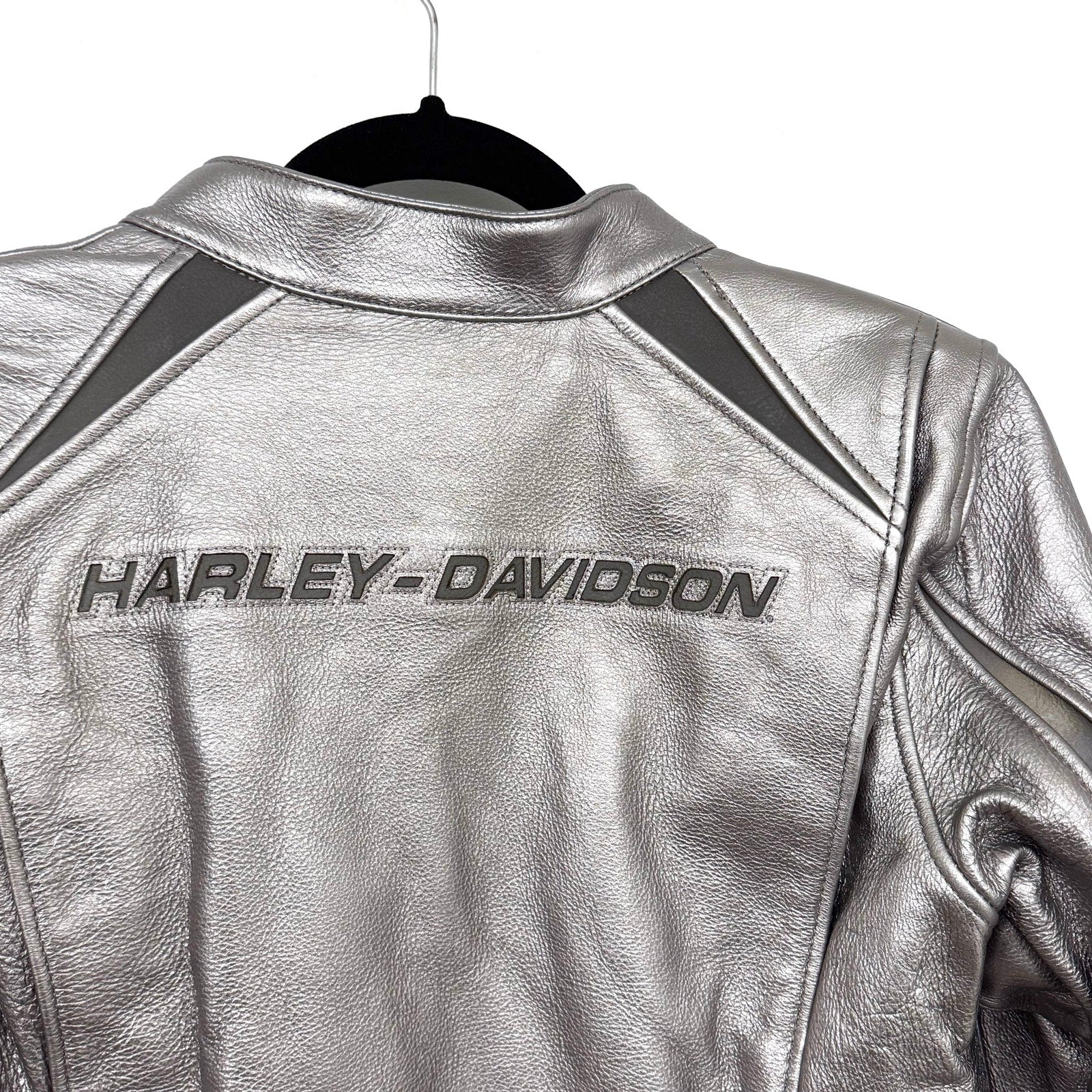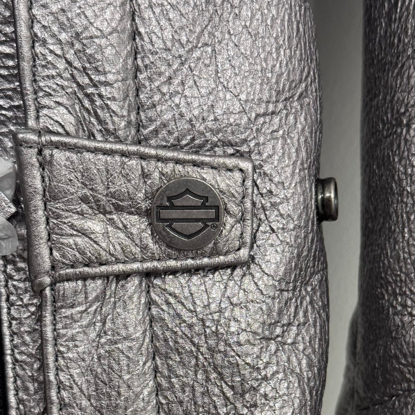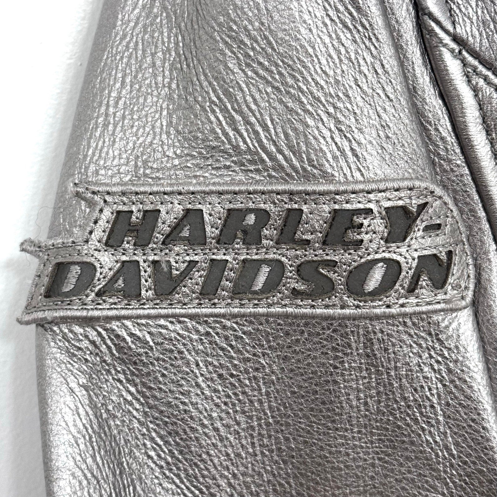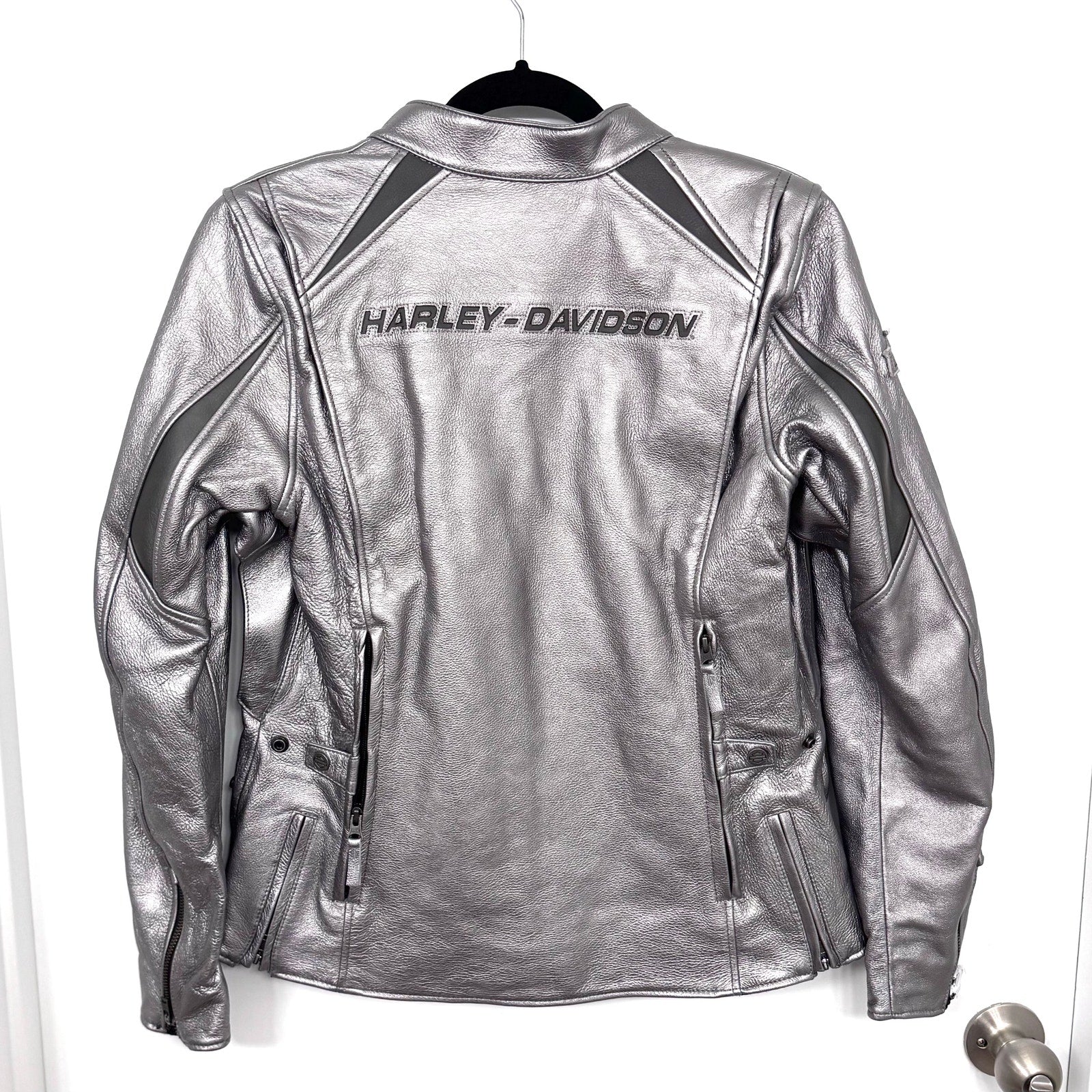 The Harley-Davidson Women's Pursuit Triple Vent Leather Jacket (98101-24VW) is a stylish motorcycle jacket designed for women. Made of silver leather, it features a full zip closure and is accented with zippers and the iconic Harley-Davidson® logo. This size small jacket is perfect for motorcycle enthusiasts or those looking for a rugged yet fashionable outerwear option.