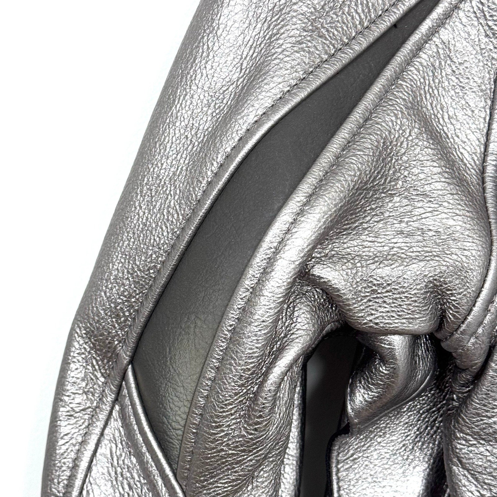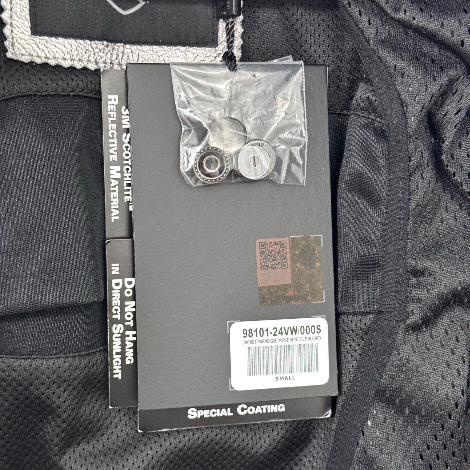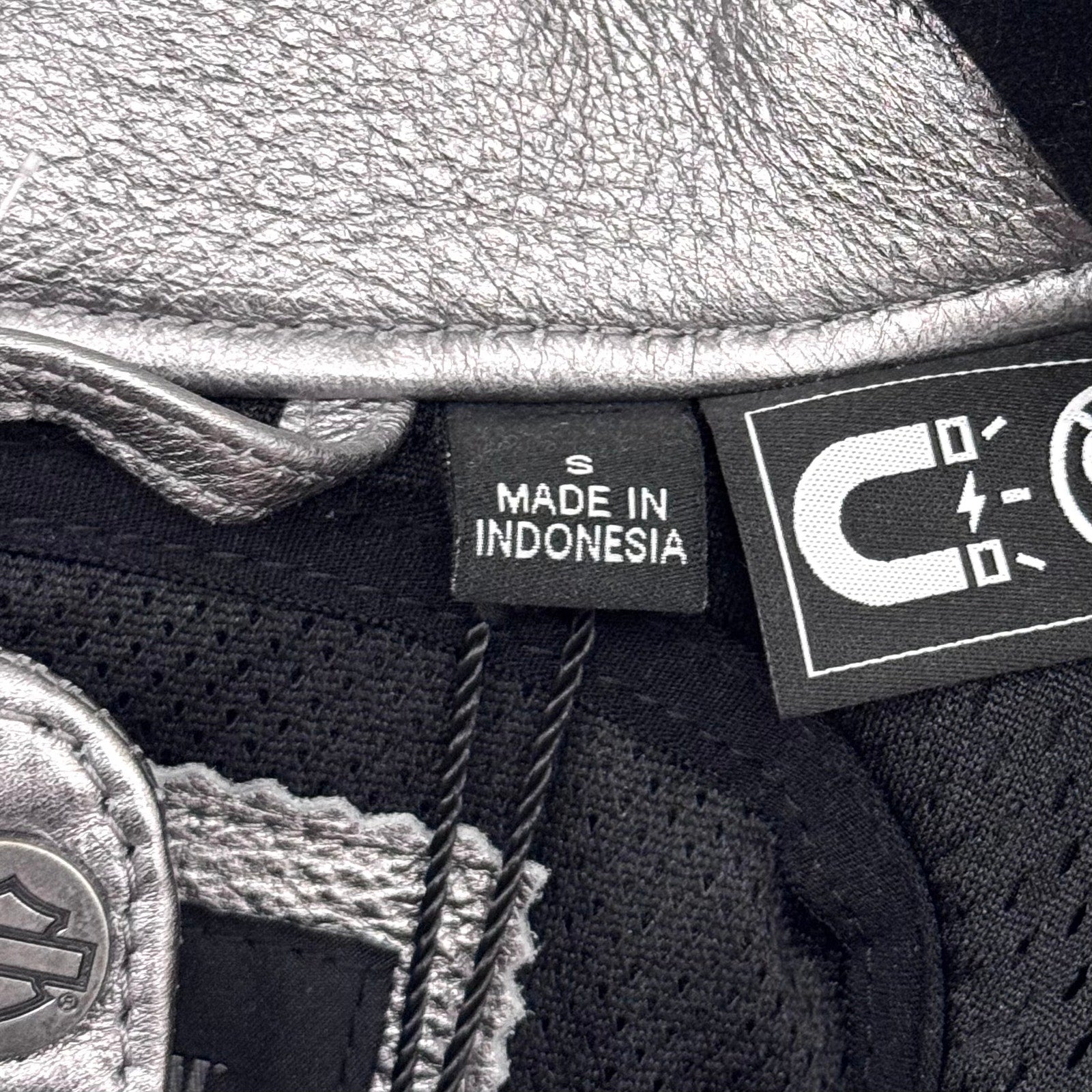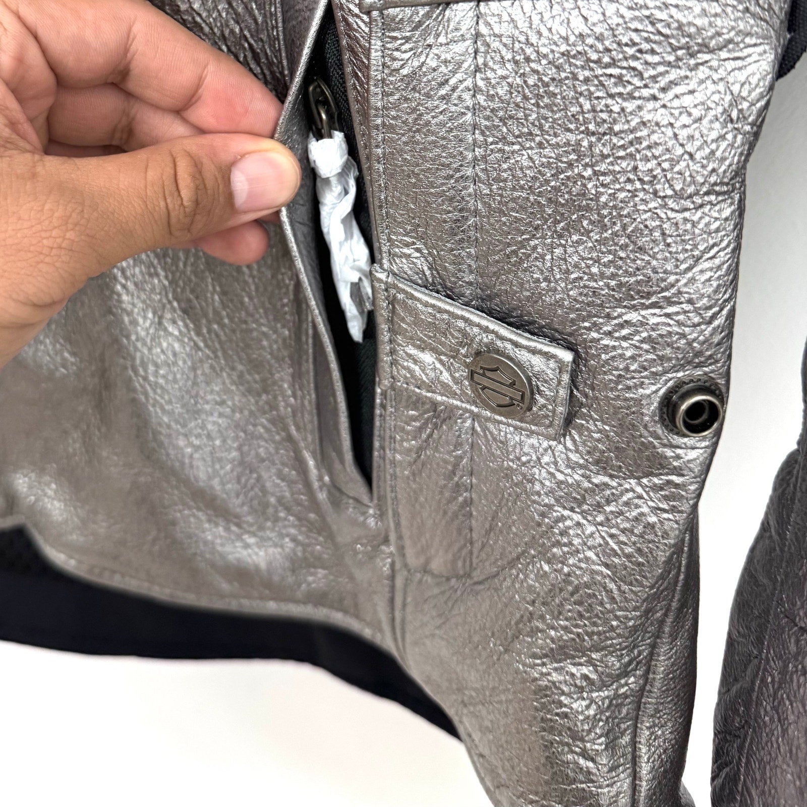 The Harley-Davidson Women's Pursuit Triple Vent Leather Jacket (98101-24VW) is a stylish motorcycle jacket designed for women. Made of silver leather, it features a full zip closure and is accented with zippers and the iconic Harley-Davidson® logo. This size small jacket is perfect for motorcycle enthusiasts or those looking for a rugged yet fashionable outerwear option.