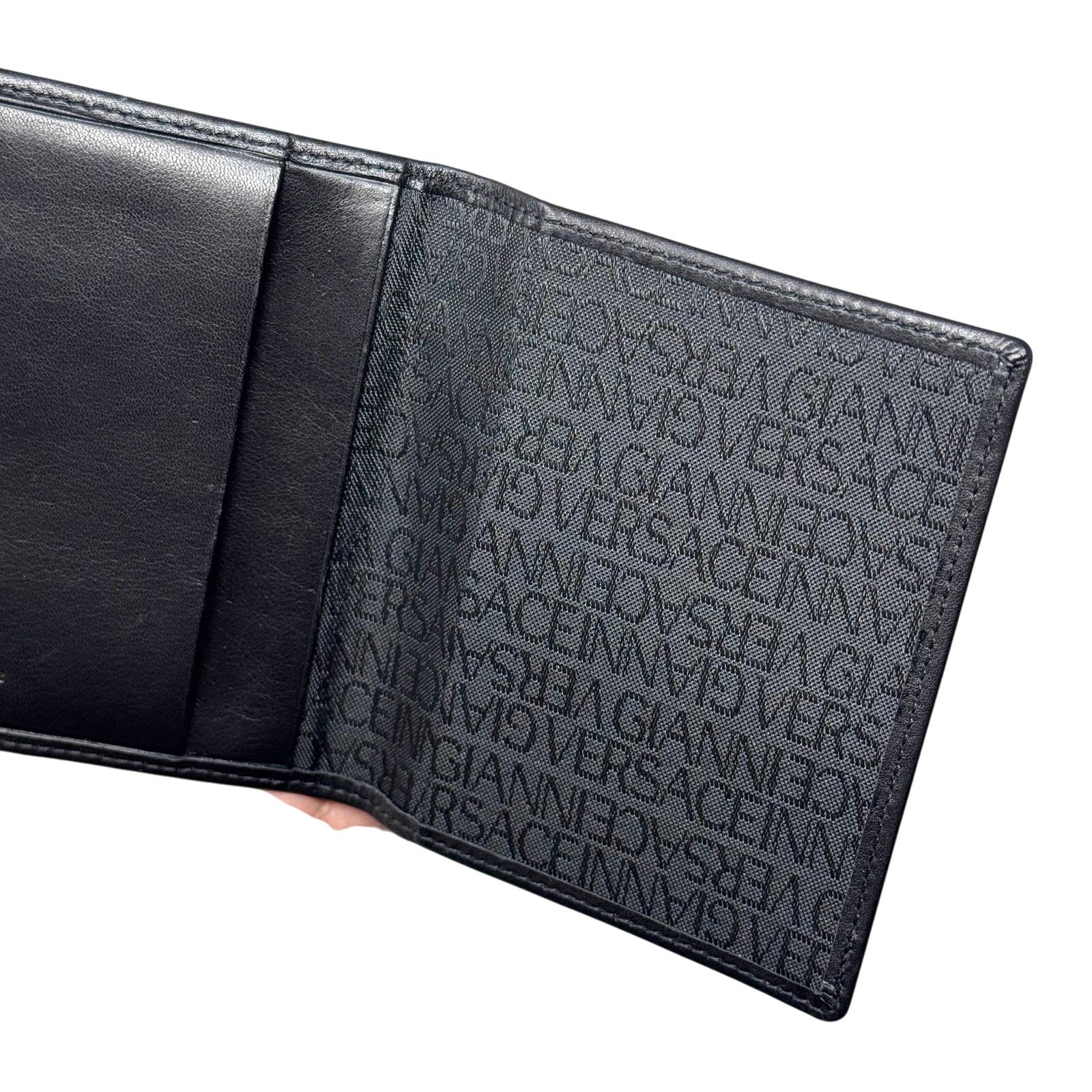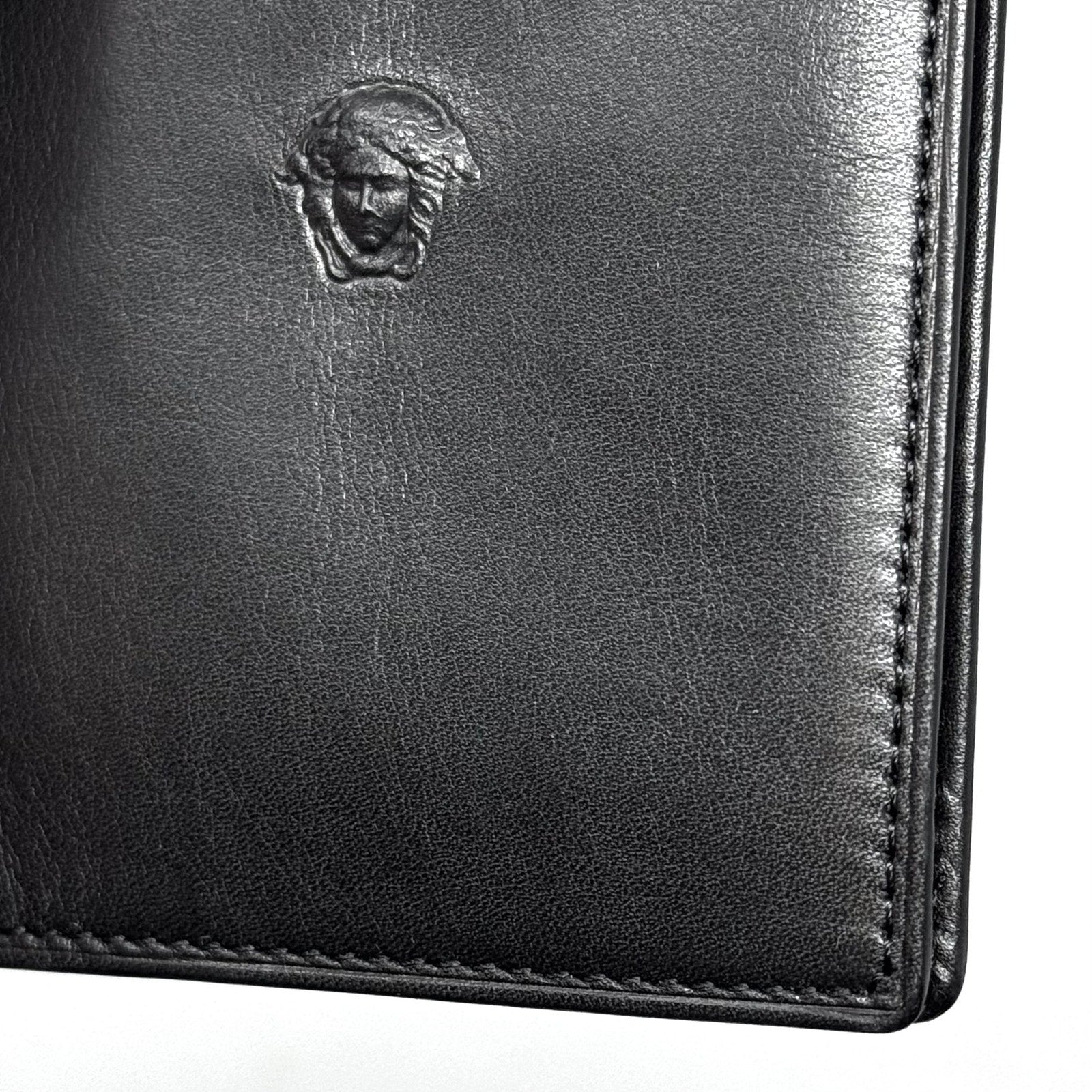 Beautiful All Black Leather Bifold Wallet with 3D Medusa Logo on the front.